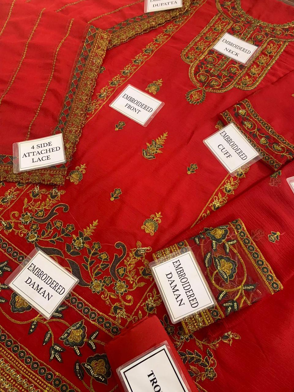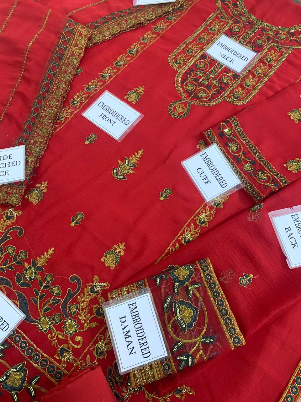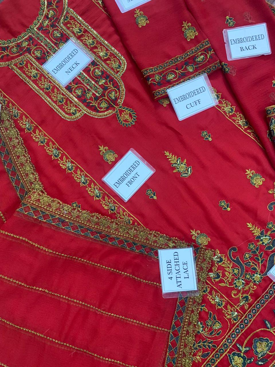 HEAVY EMBROIDERED CHIFFON FRONT WITH EMBROIDERED NECK ON FABRIC ALONG WITH EMBROIDERED CHAAK PATTI AND DAMAN PATCH