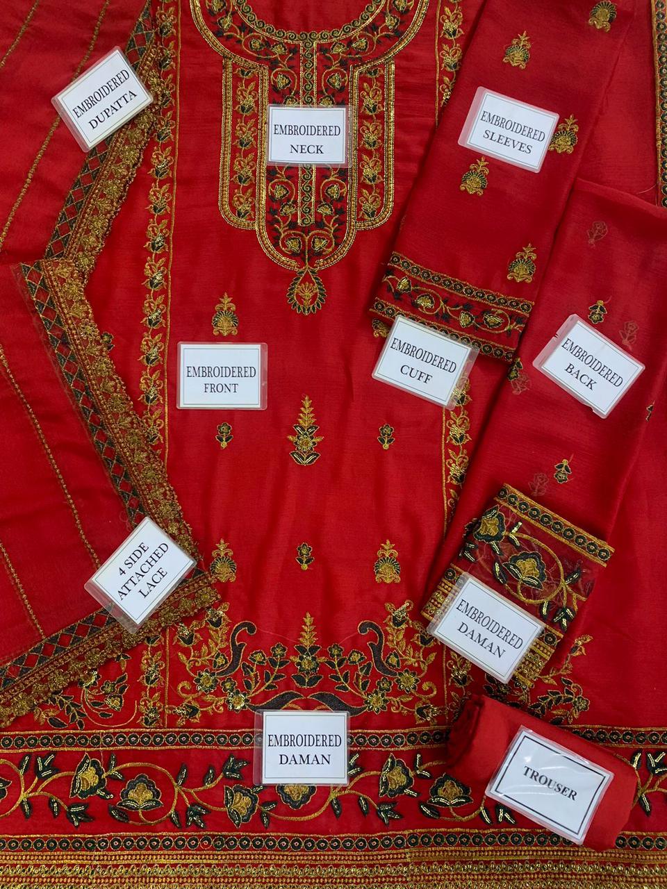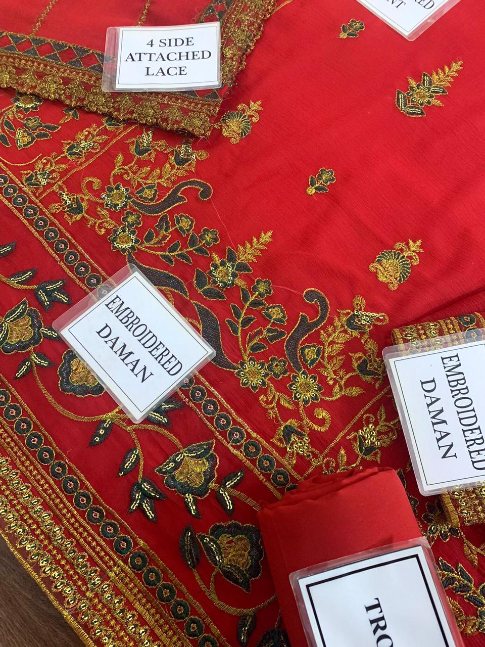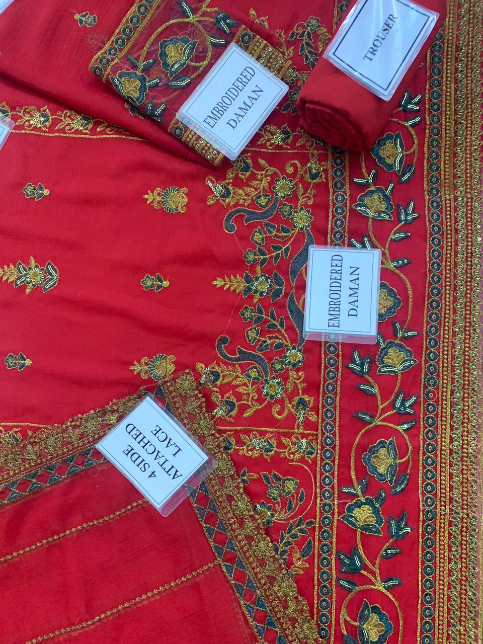 HEAVY EMBROIDERED CHIFFON FRONT WITH EMBROIDERED NECK ON FABRIC ALONG WITH EMBROIDERED CHAAK PATTI AND DAMAN PATCH