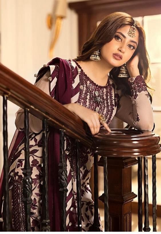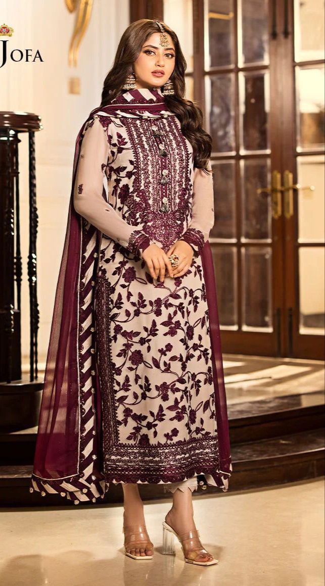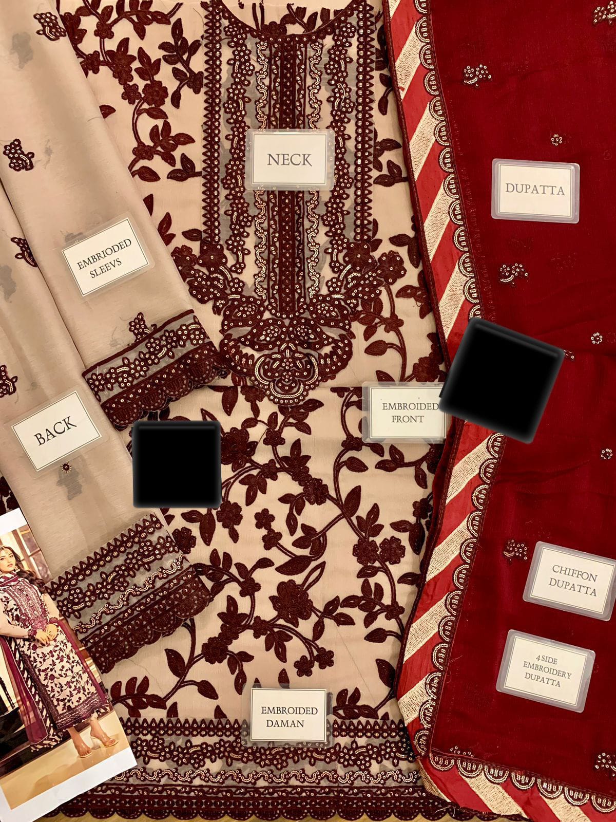 chiffon fully heavy shaneel embroidered front with heavy embroidered spengle work neckline with heavy embroidered spengle work daman boarder with embroidered spengle work chak lace