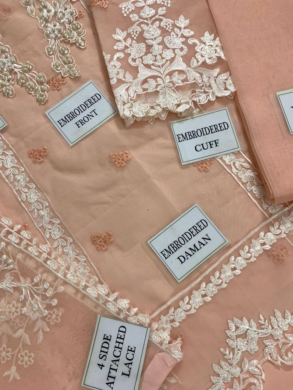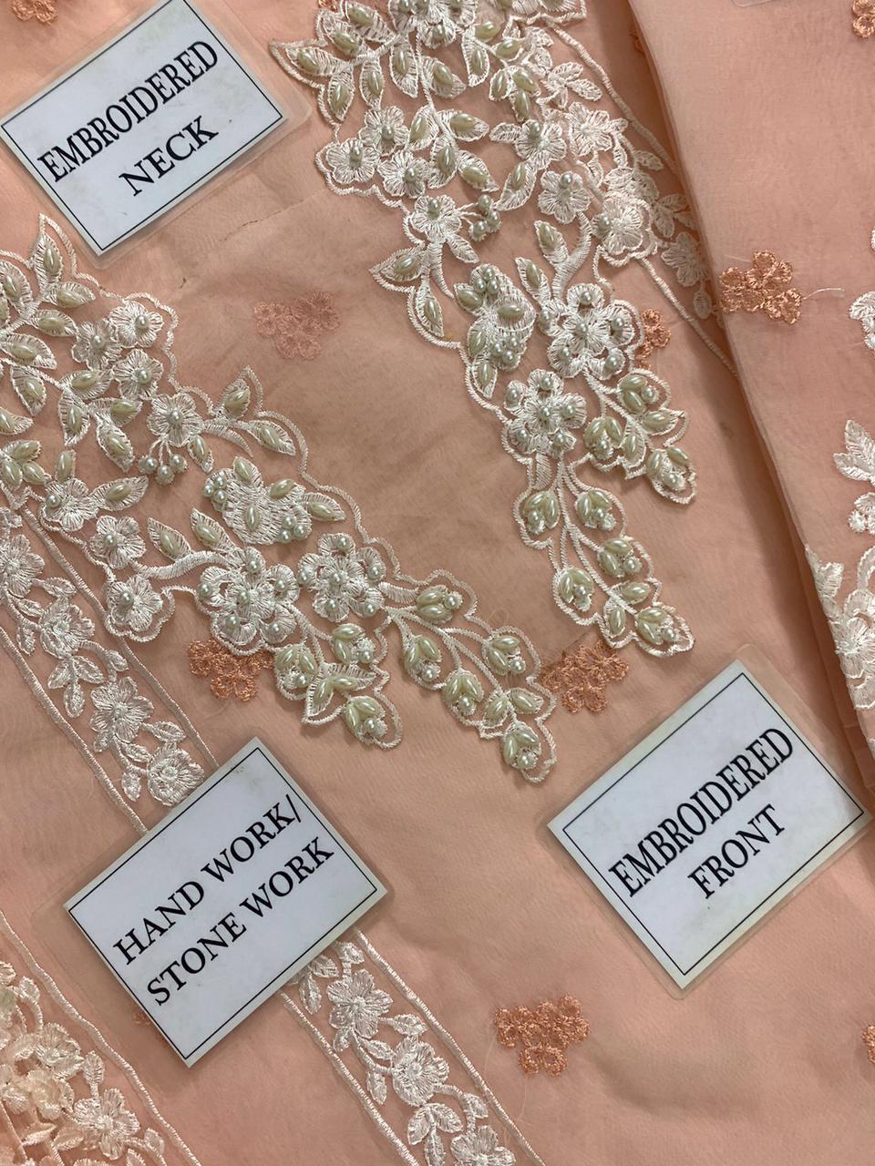 EMBROIDERED ORGANZA FRONT WITH EMBROIDERED NECK PATCH EMBELLISHED WITH ADDA WORK AND HANDAWORK ALONG WITH CUTWORK DAMAN PATCH