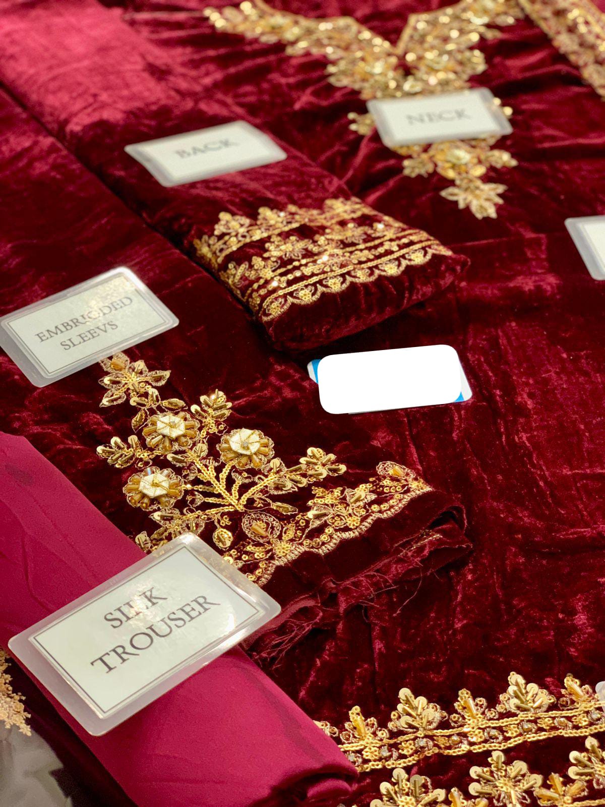 velvet embroidered sleeves with fully heavy hand emblishment adha work with embroidered sleeves bunches with fully hand emblishment adha work