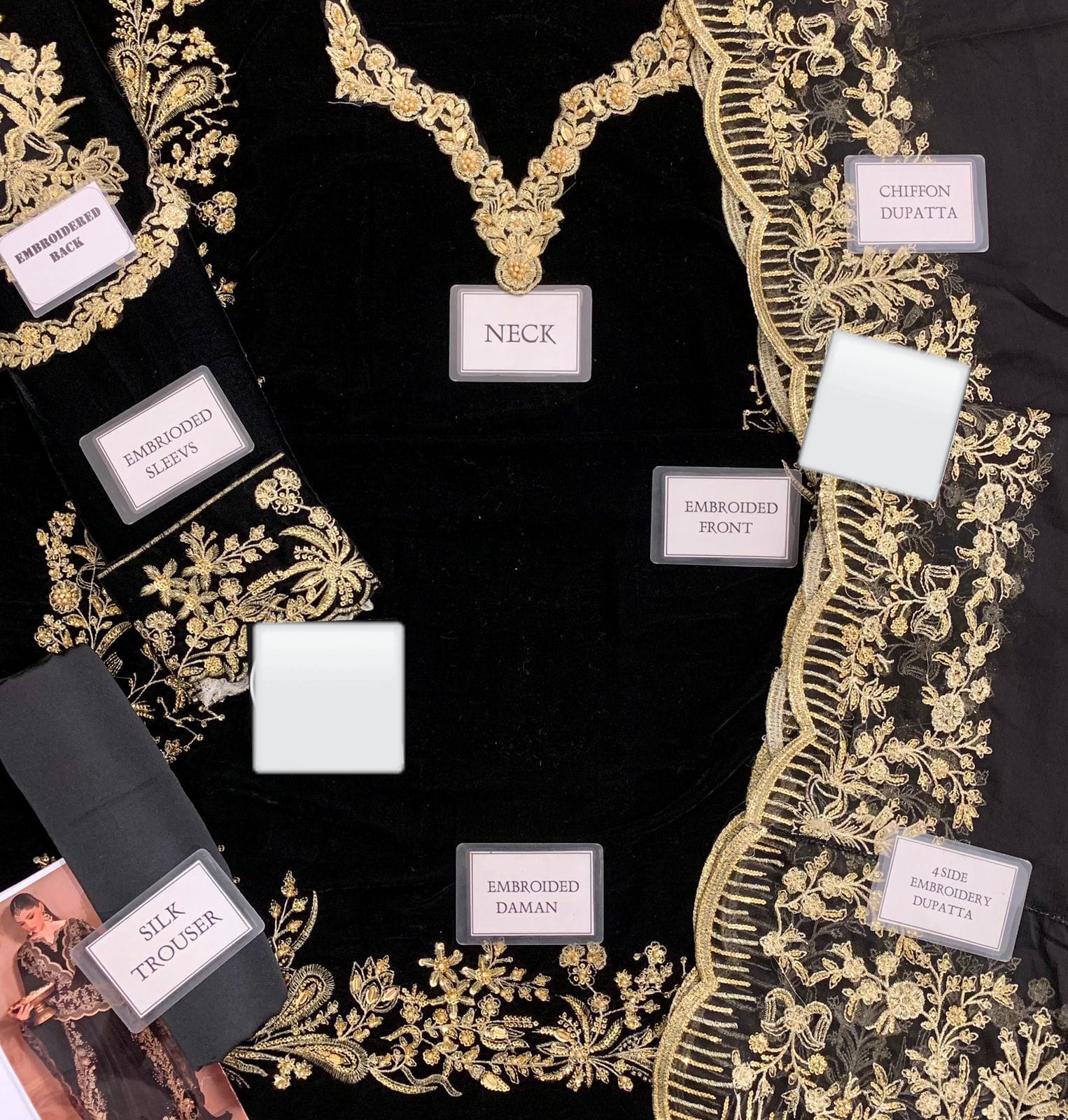 Velvet fully heavy alternate embroidered spangle work front with fully heavy hand emblishment adha work with embroidered spangle work neckline with fully hand emblishment adha work with embroidered spangle work front chak lace