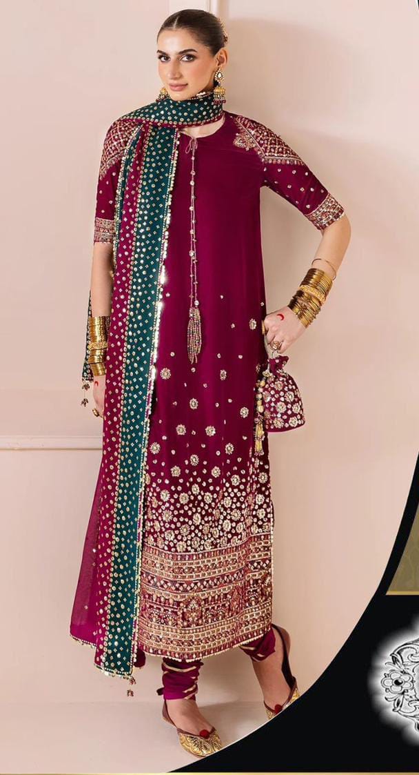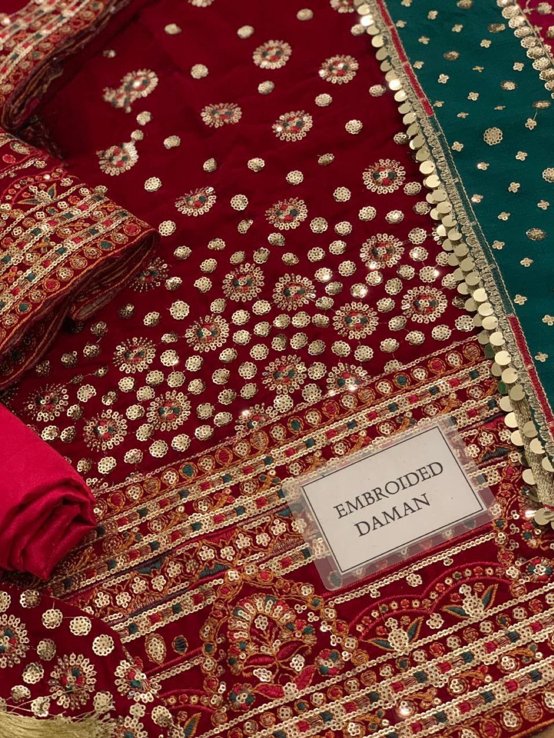 *Velvet fully heavy embroidered spengle work front with fully heavy velvet embroidered spengle work daman boarder with embroidered spengle work soldier bunches*