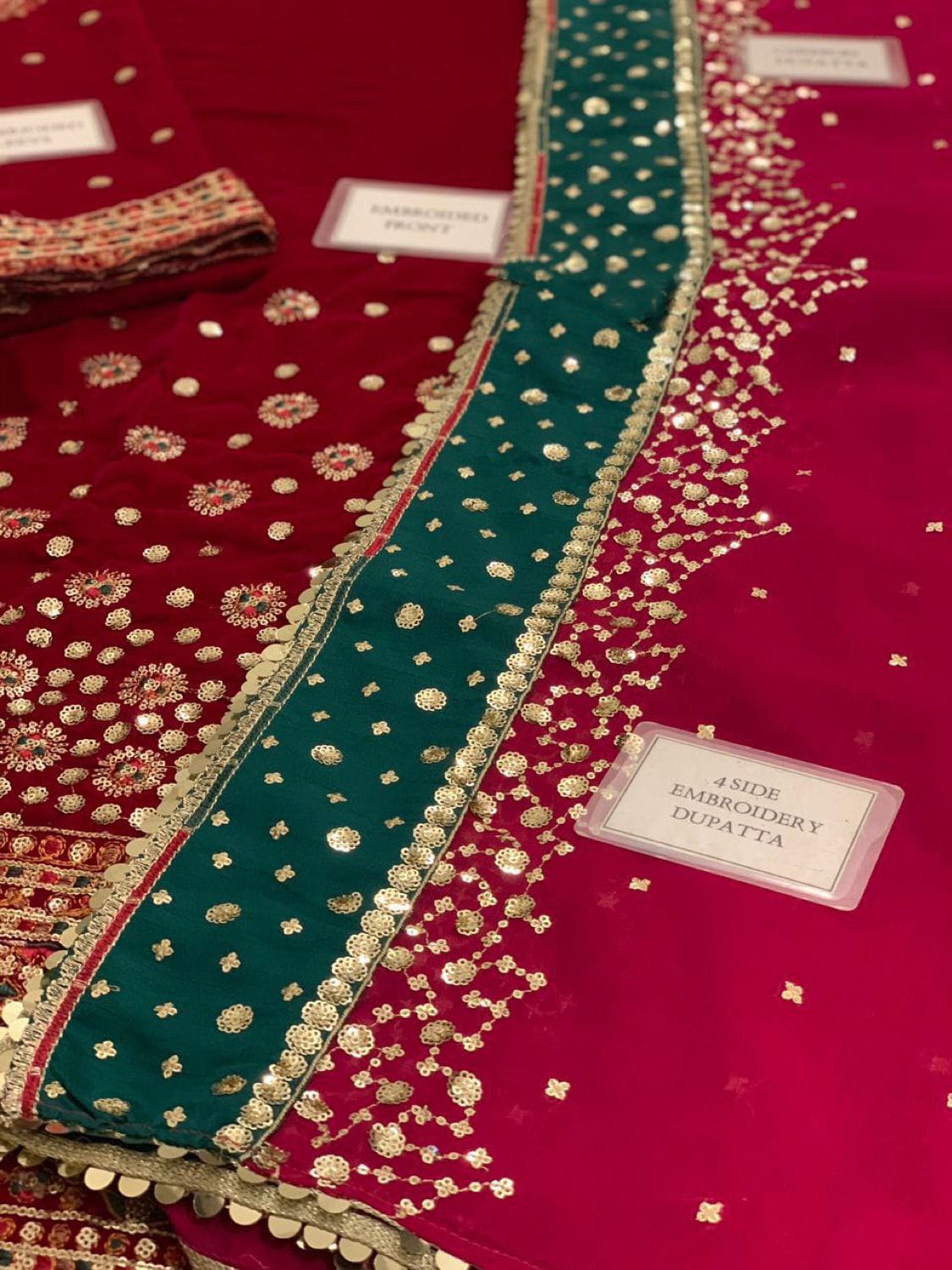 *chiffon fully embroidered spengle work duphta with 2 side raw silk embroidered spengle work boarder attach with 4 side fancy lace attach*