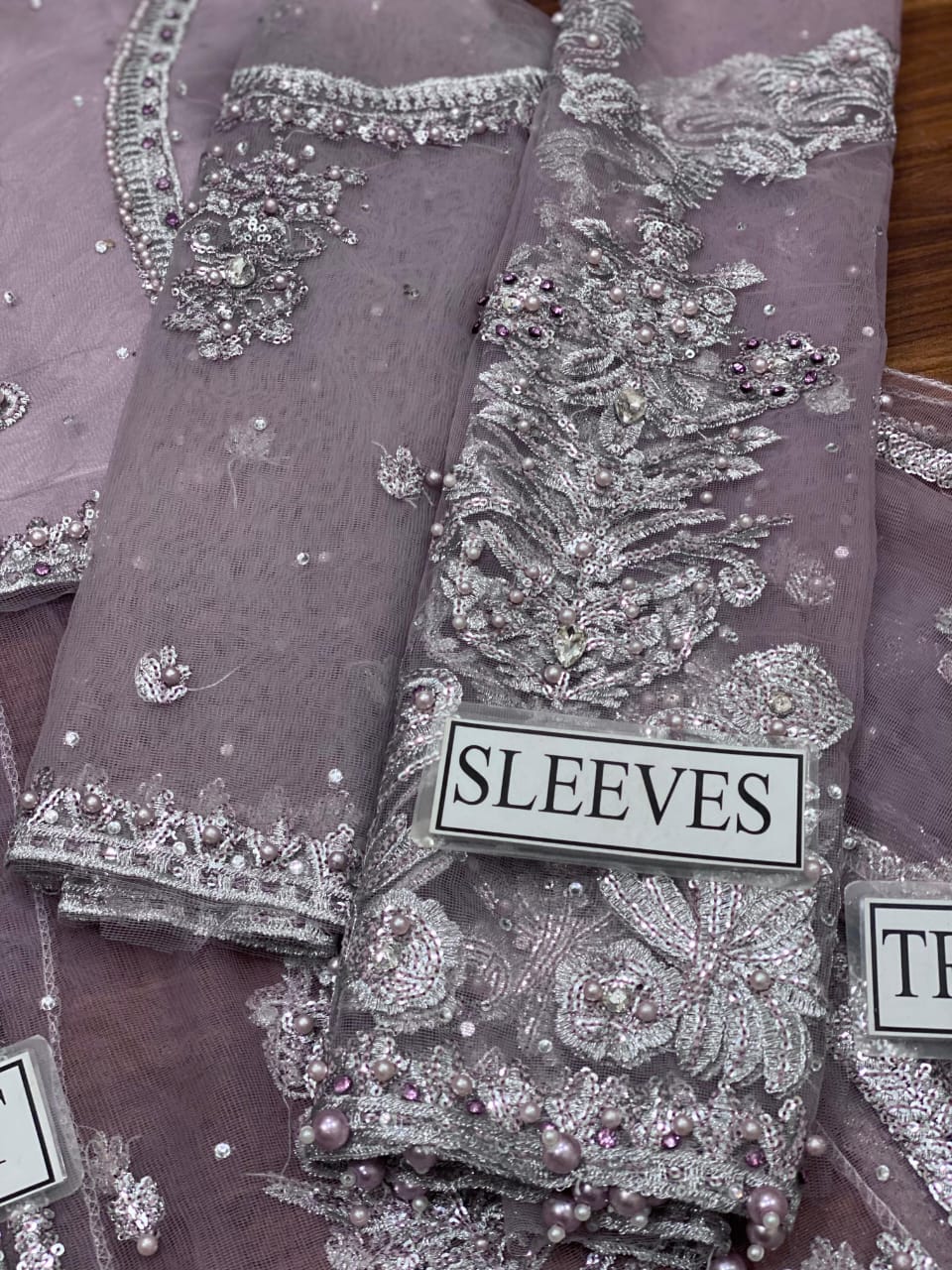 Sleeves embroidery on fabric slightly Sequence work on it with hand work & pearl attached