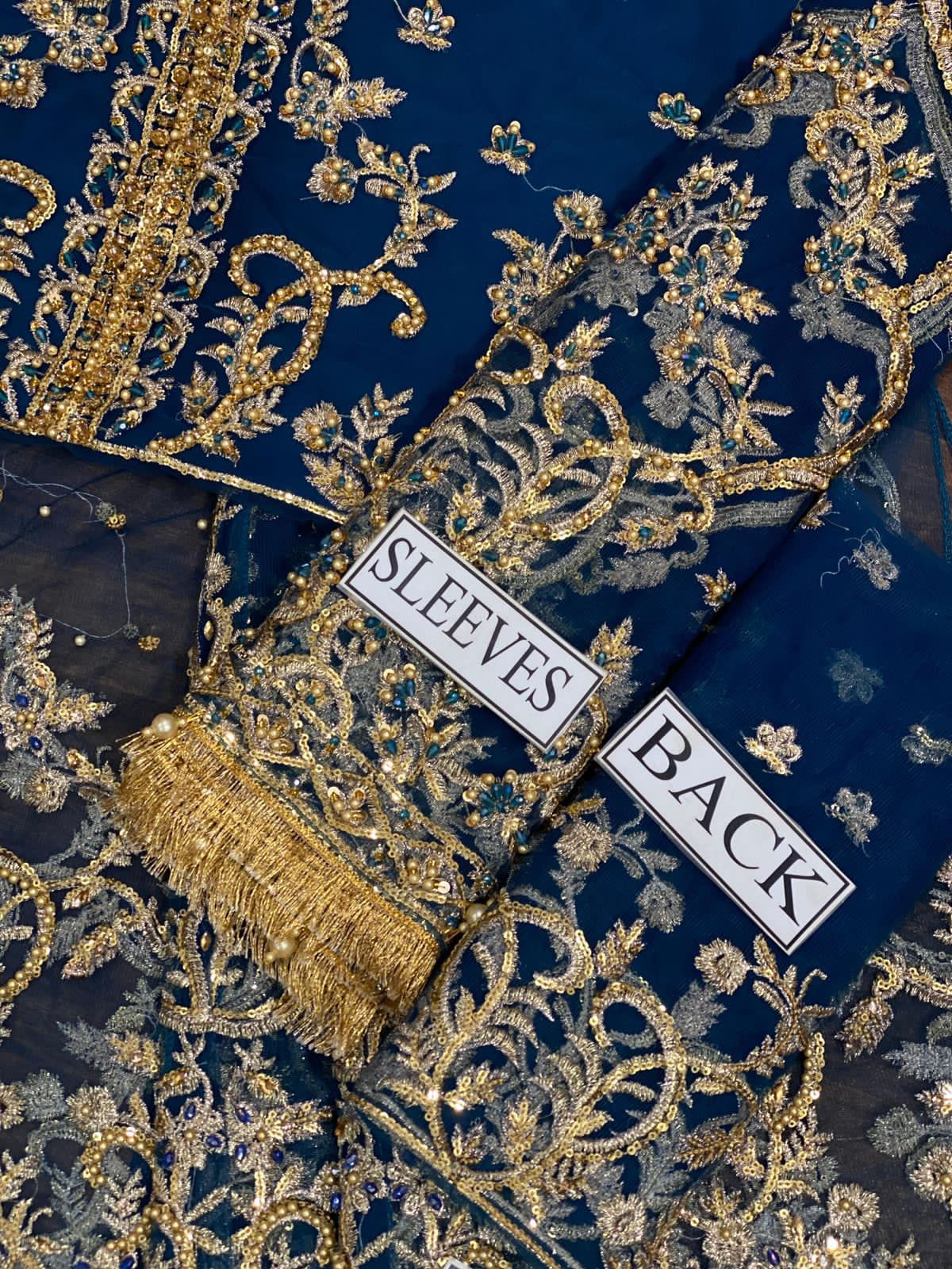 Sleeves embroidery on fabric slightly Sequence work on it with peral work & attached tasal