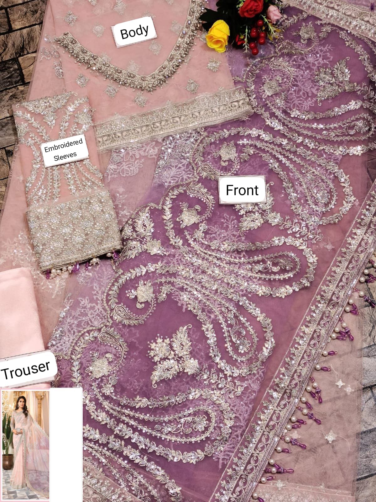 *net fully heavy embroidered spengle work gherra & fully heavy embroidered spengle work pallou with 4 side heavy embroidered spengle work pallou boarder attachment & gherra embroidered spengle work boarder attachment with heavy fancy tulses attach*