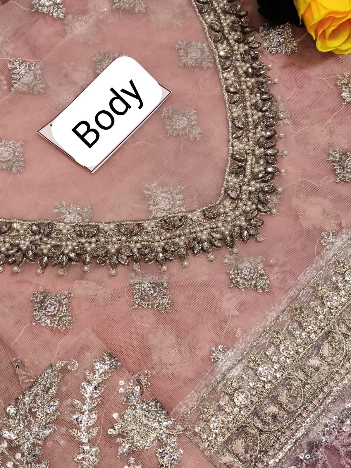 *net fully heavy embroidered spengle work front body with adha emblishment necklace*