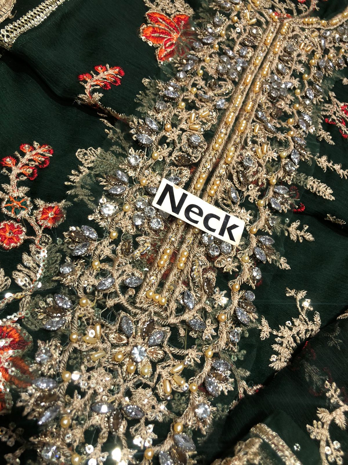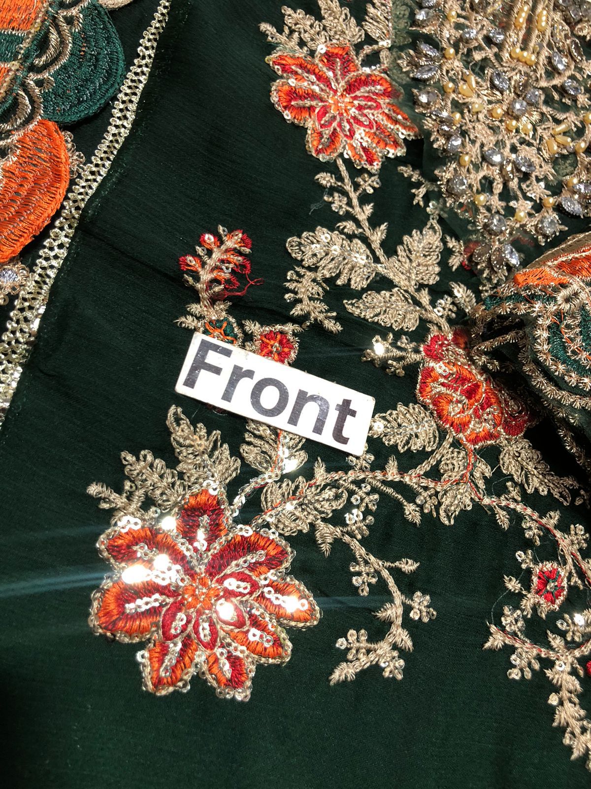 *chiffon fully heavy embroidered spengle work centre panel with heavy embroidered spengle work neckline with heavy hand emblishment adha work with heavy embroidered spengle work side panel attach with heavy embroidered spengle work daman boarder*