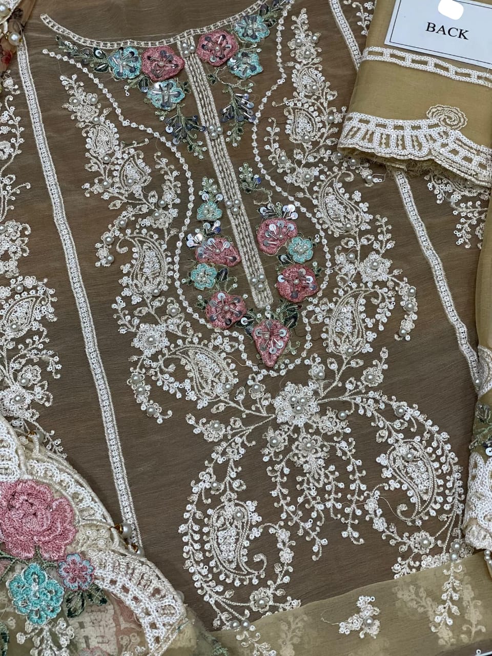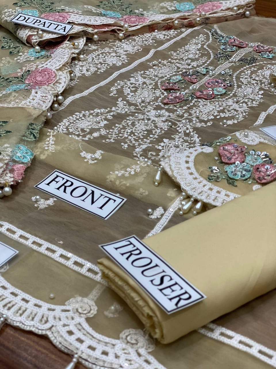Chiffon heavy embroided front with attach 3D flowers and adda work on front