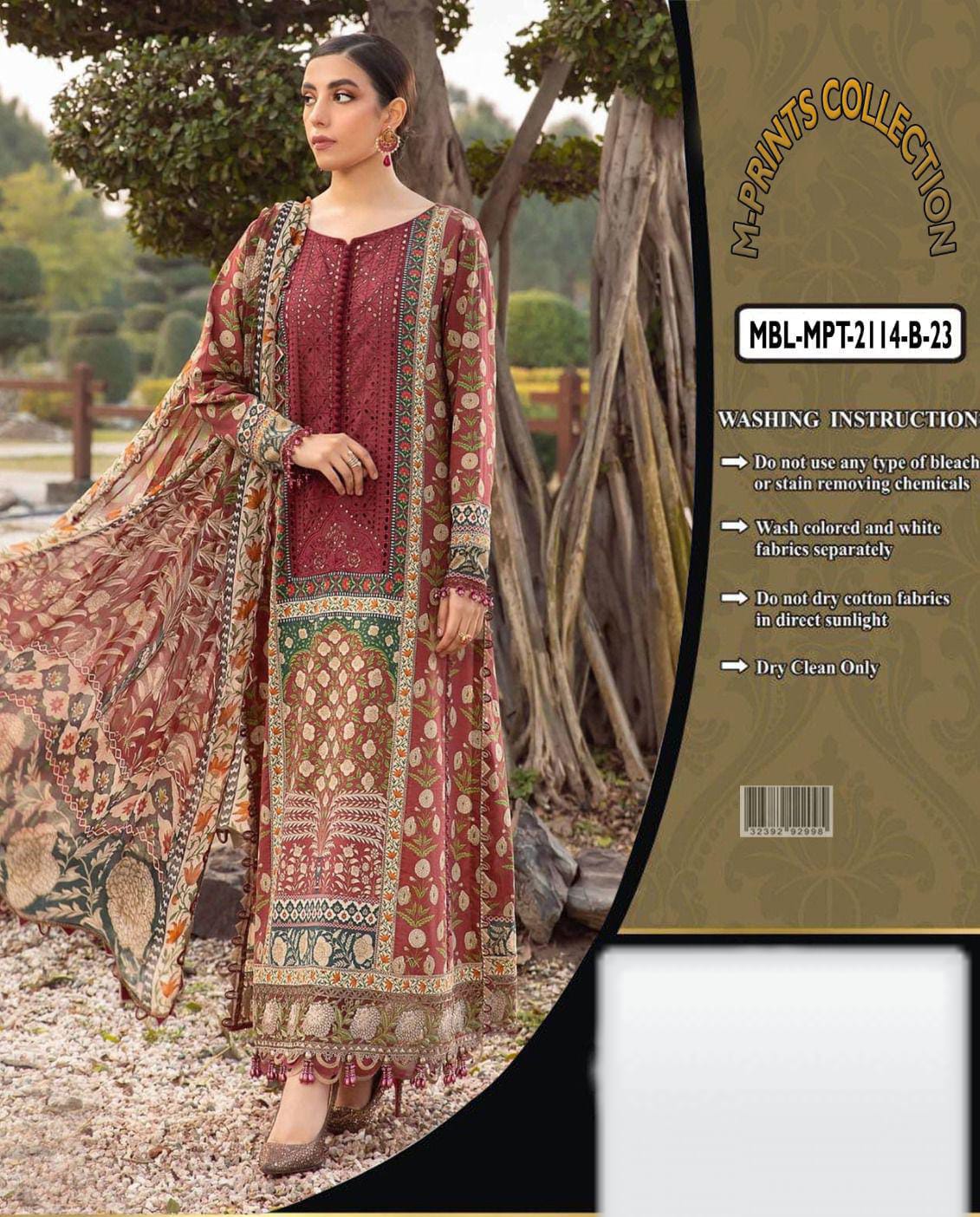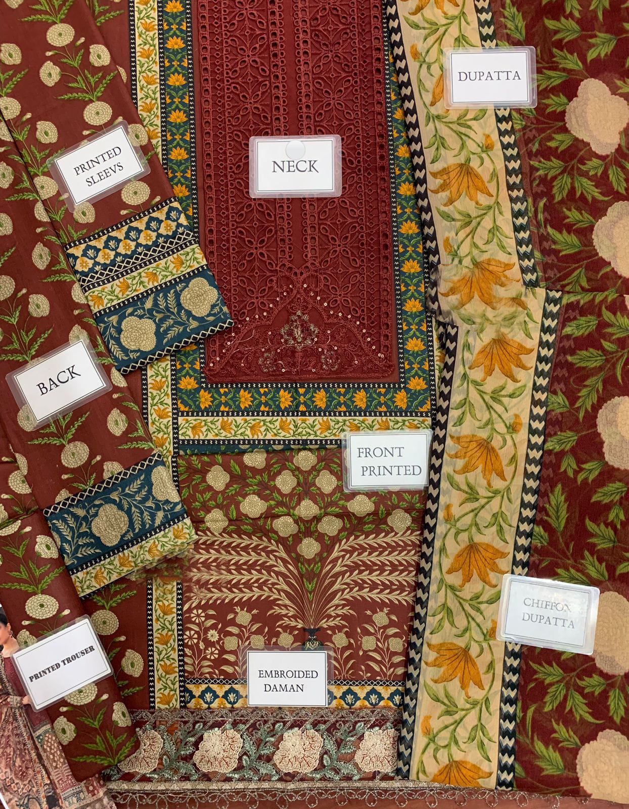 Printed lawn front with heavy embroidered scifflie neckline with heavy embroidered daman boarder