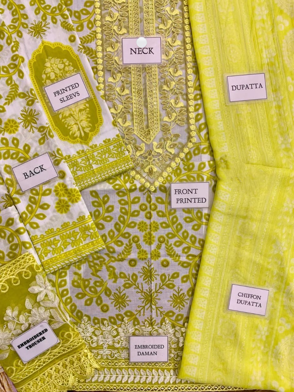 printed lawn front with heavy embroidered spengle work neckline with heavy embroidered spengle work daman boarder
