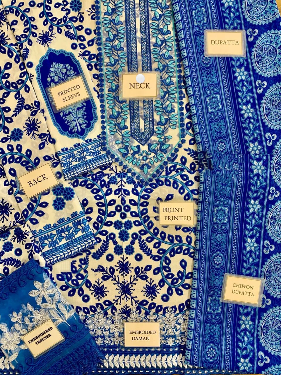 printed lawn front with heavy embroidered spengle work neckline with heavy embroidered spengle work daman boarder