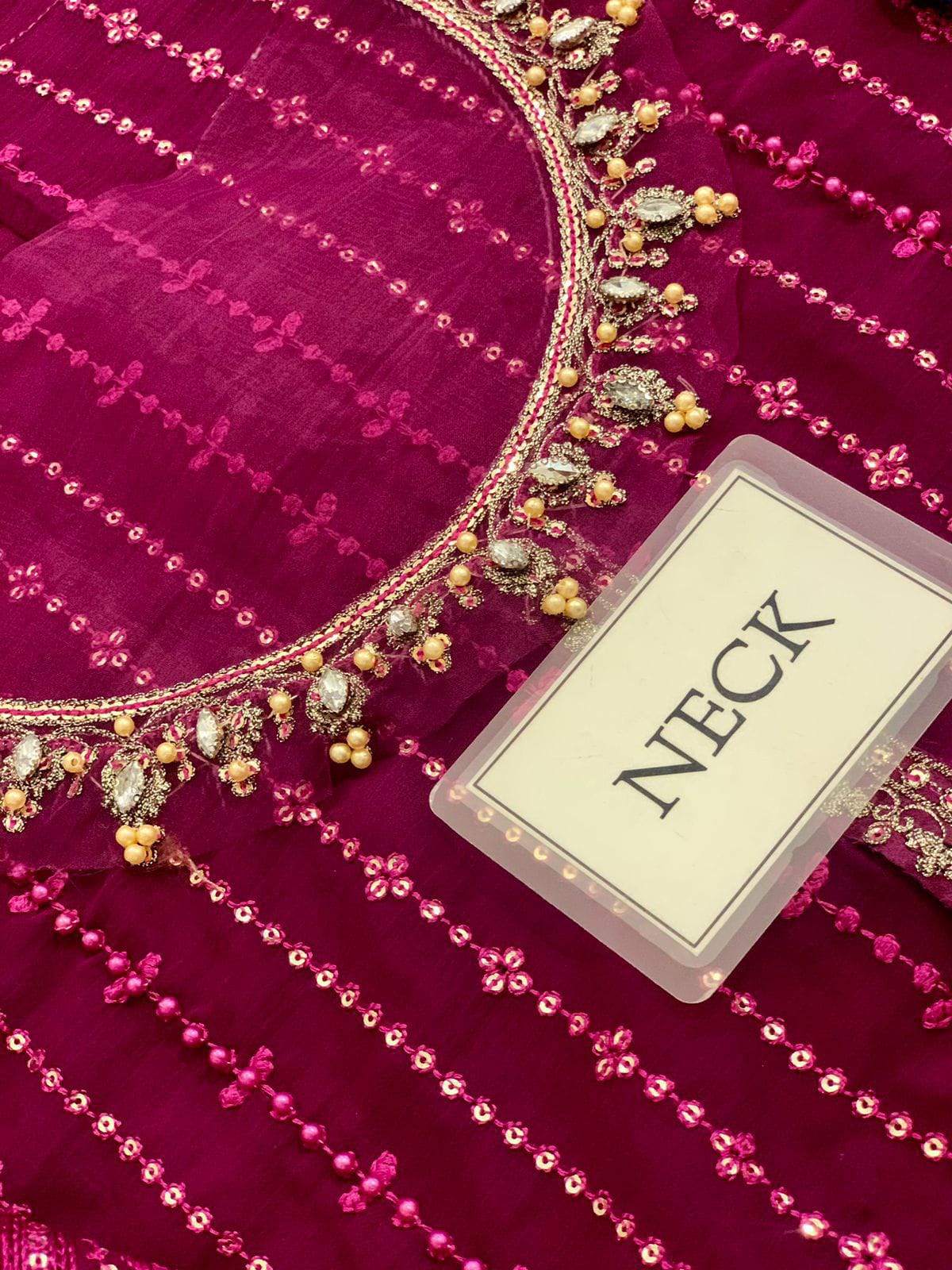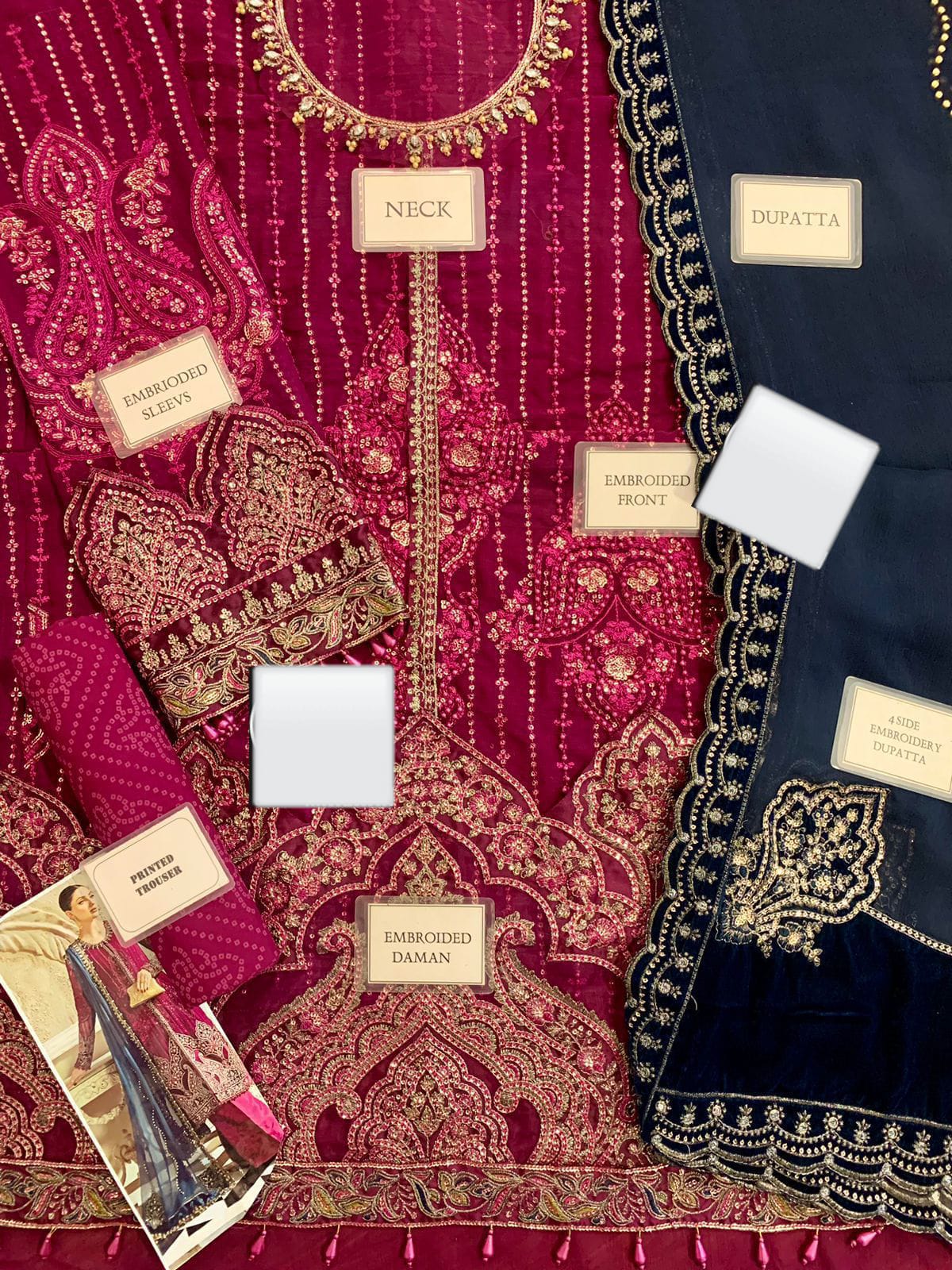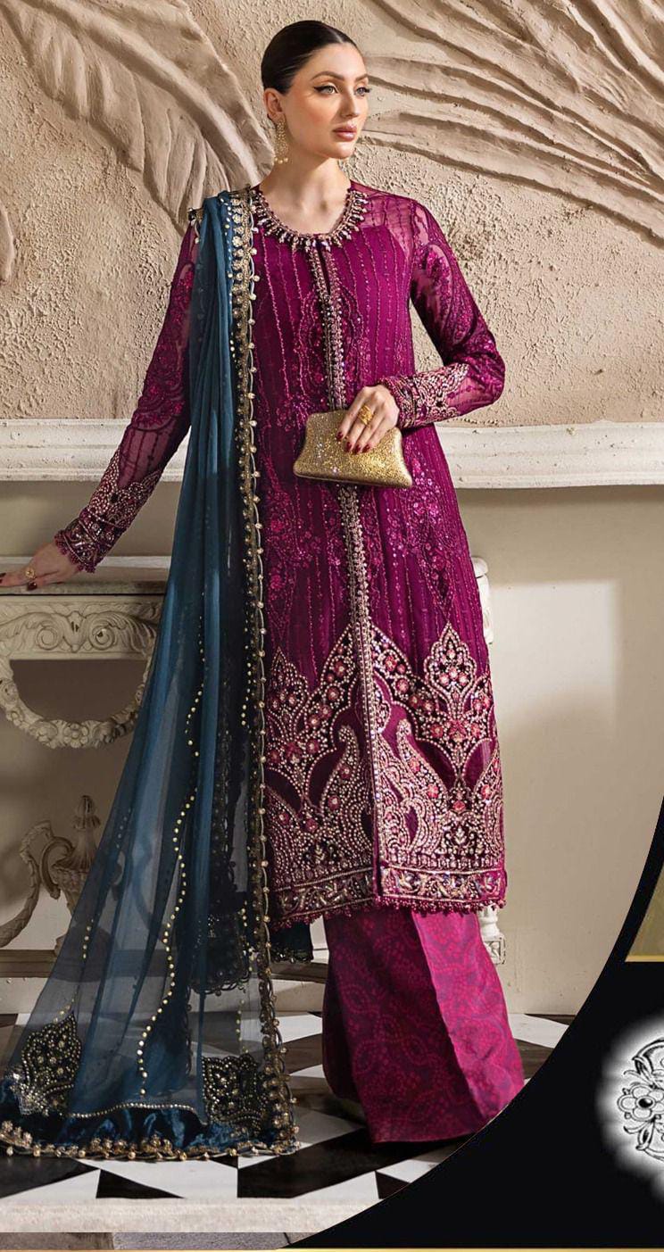 *chiffon fully heavy embroidered spengle left & right panel with fully hand emblishment adha work with embroidered spengle work neckline with hand emblishment adha work with embroidered spengle work centre panel lace with heavy embroidered spengle work & laser work daman boarder with fancy tulses attach*