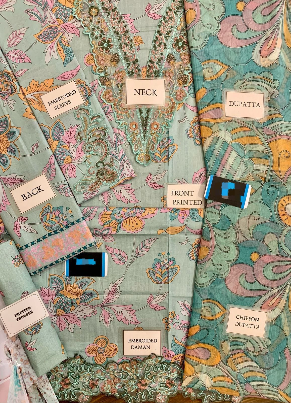 digital printed lawn front with heavy embroidered neckline with heavy embroidered daman boarder with embroidered daman bunches