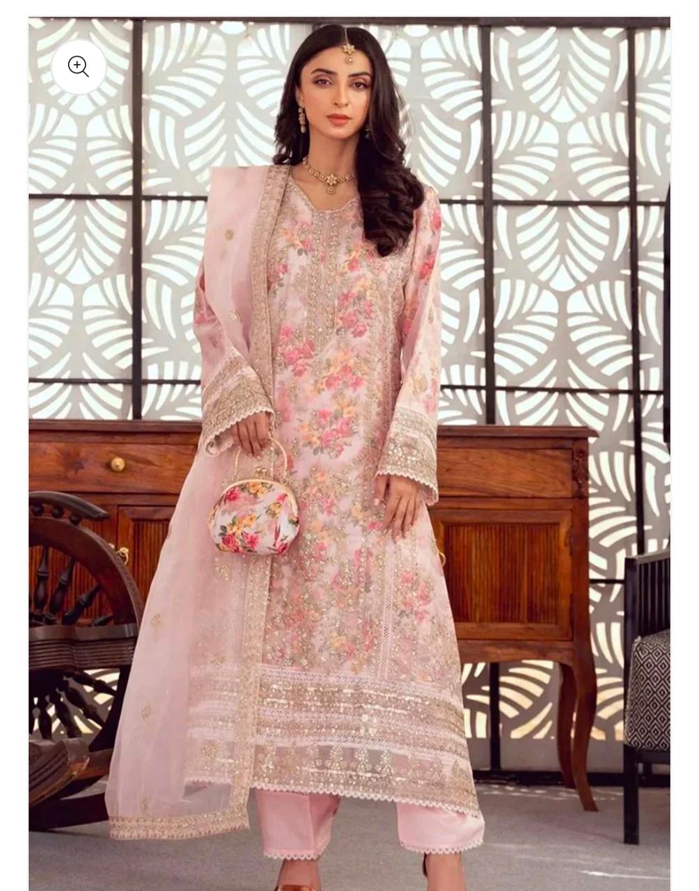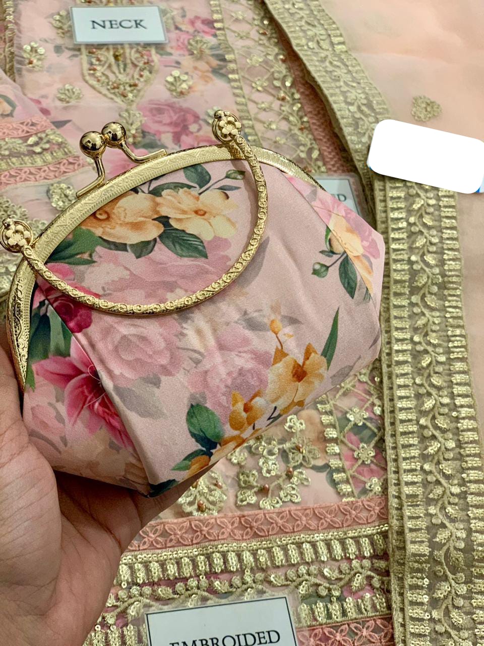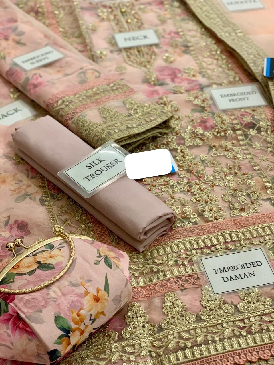 ORGANZA EMBROIDERED SEQUENCE FRONT EMBELISH WITH HANDWORK AND HANGING TUSSLES ON DAMAN